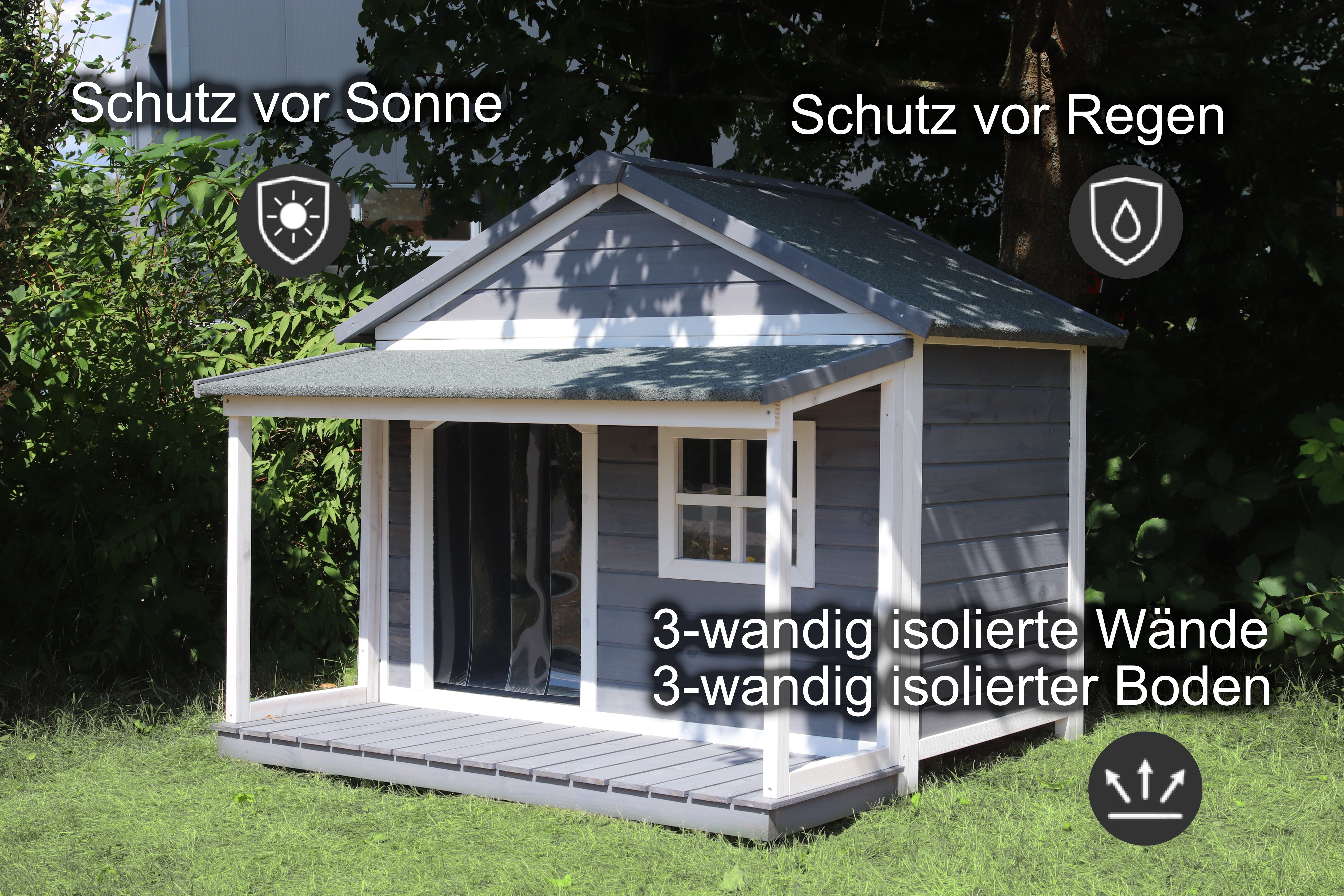 Wetterfestes, vollisoliertes Hundehaus (Bausatz) mit Satteldachhttps://hunde-huetten.de/cogi-glossary/hover/c3e9a5dd58ae4857a738d61423b9d014, überdachter Terrasse und weiteren Ausstattungs-Extras.