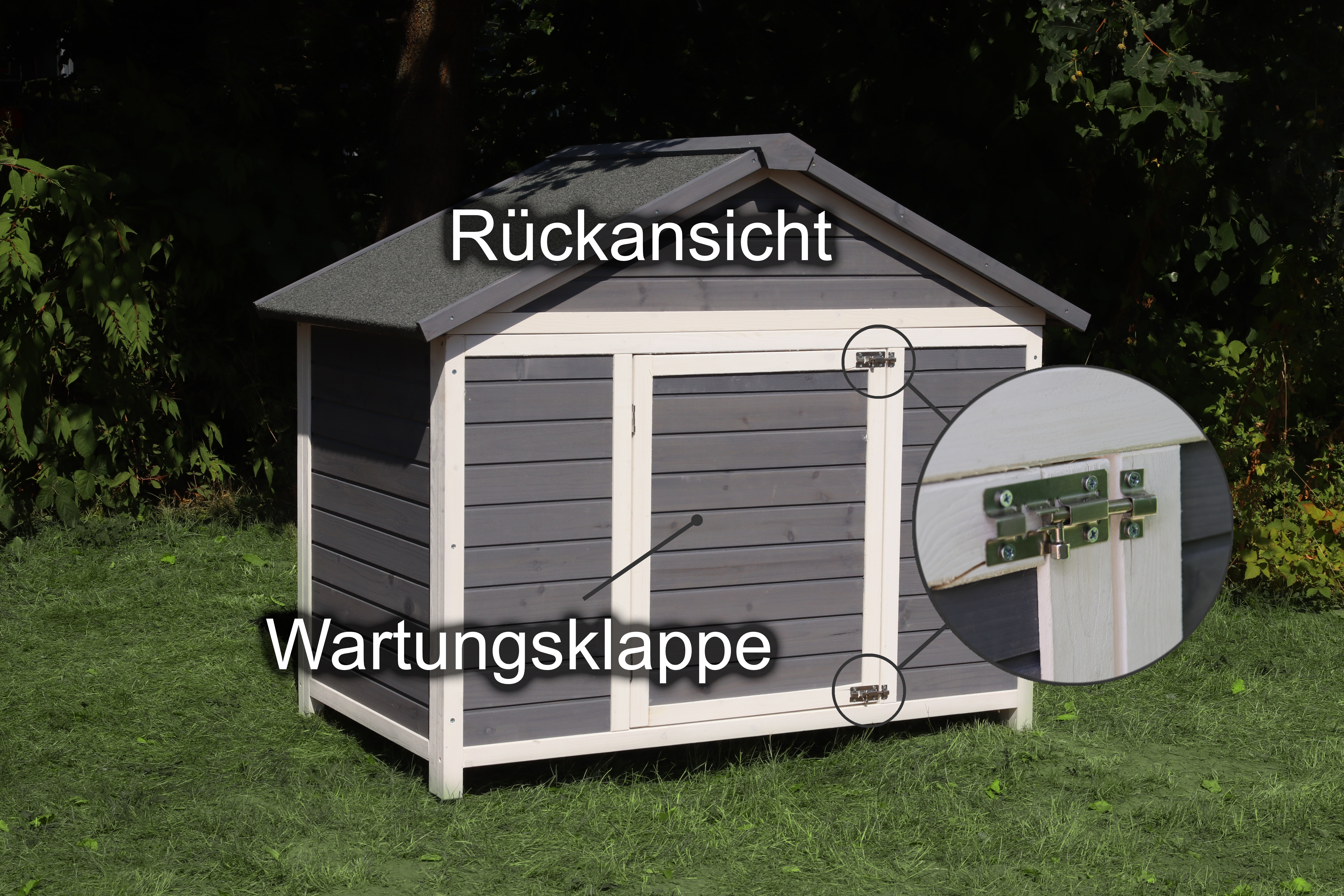 Satteldachhttps://hunde-huetten.de/cogi-glossary/hover/c3e9a5dd58ae4857a738d61423b9d014 und Verandadach sind mit Dachpappe geschützt. Das Haus verfügt über ein Fenster, Pendelklappehttps://hunde-huetten.de/cogi-glossary/hover/f3ac9217f6624079a86a39fd994f2376 und eine Terrasse. In die Rückwand ist eine große Tür eingearbeitet, damit die Hütte von innen bequem gereinigt werden kann.