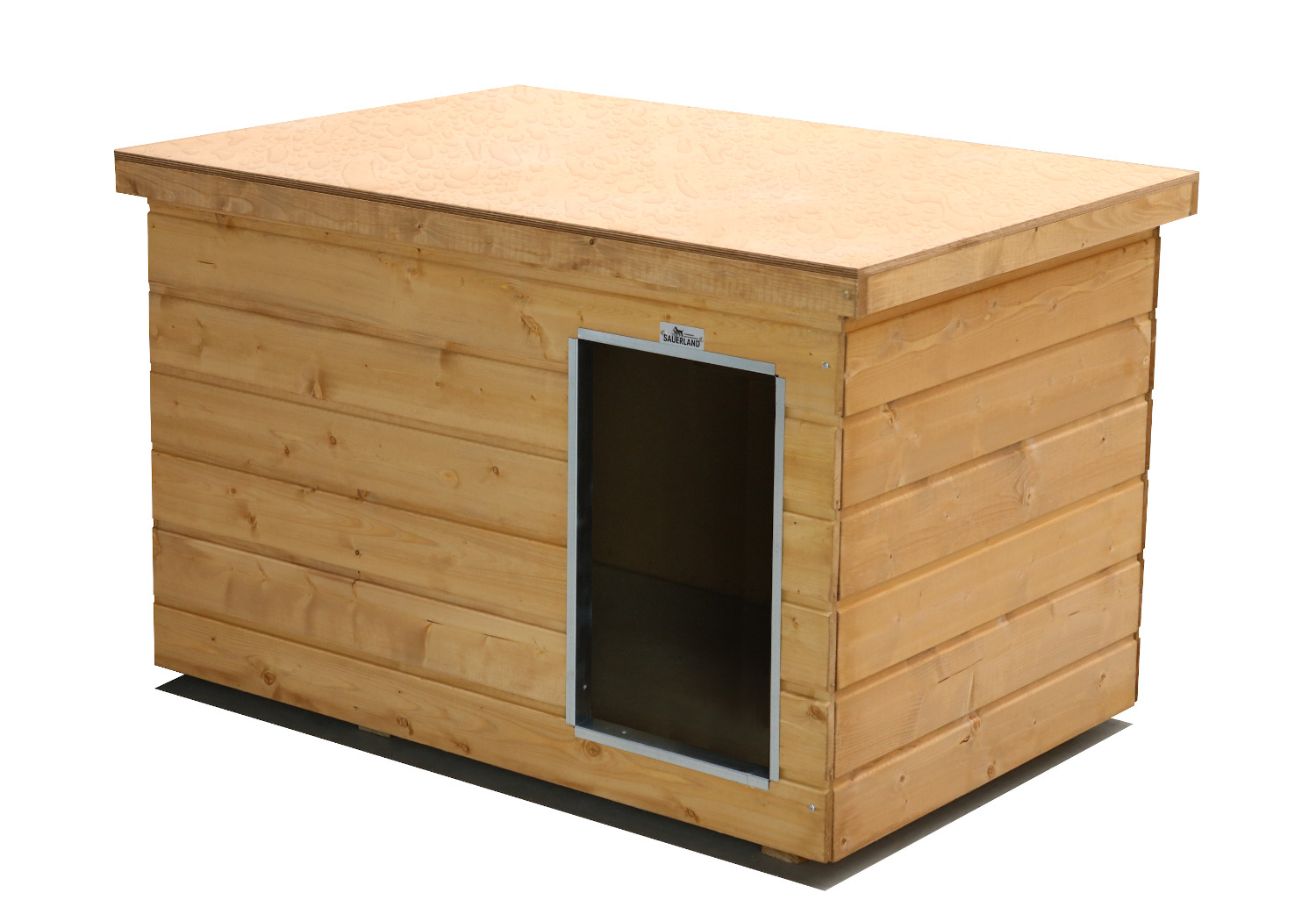 Original SAUERLAND Holz-Hundehütte, braun imprägniert | Flachdach Dickschicht | Eingang Längsseite | Größe Lassie
