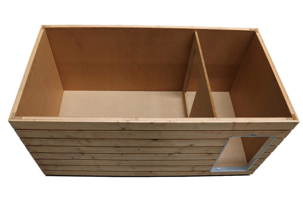 Diese Hundehütte mit Zwischenwand bietet den gleichen Liegeraum wie eine 1-Raum-Hütte, verfügt aber über eine extra Vorraum, der als Windfang dient und Schutz vor Wind und Niederschlägen bietet. Je nach Wunsch kann die Trennwand auch versetzt montiert oder aber ganz weggelassen werden, so dass Sie einen einzigen, längeren Liegeraum erhalten.