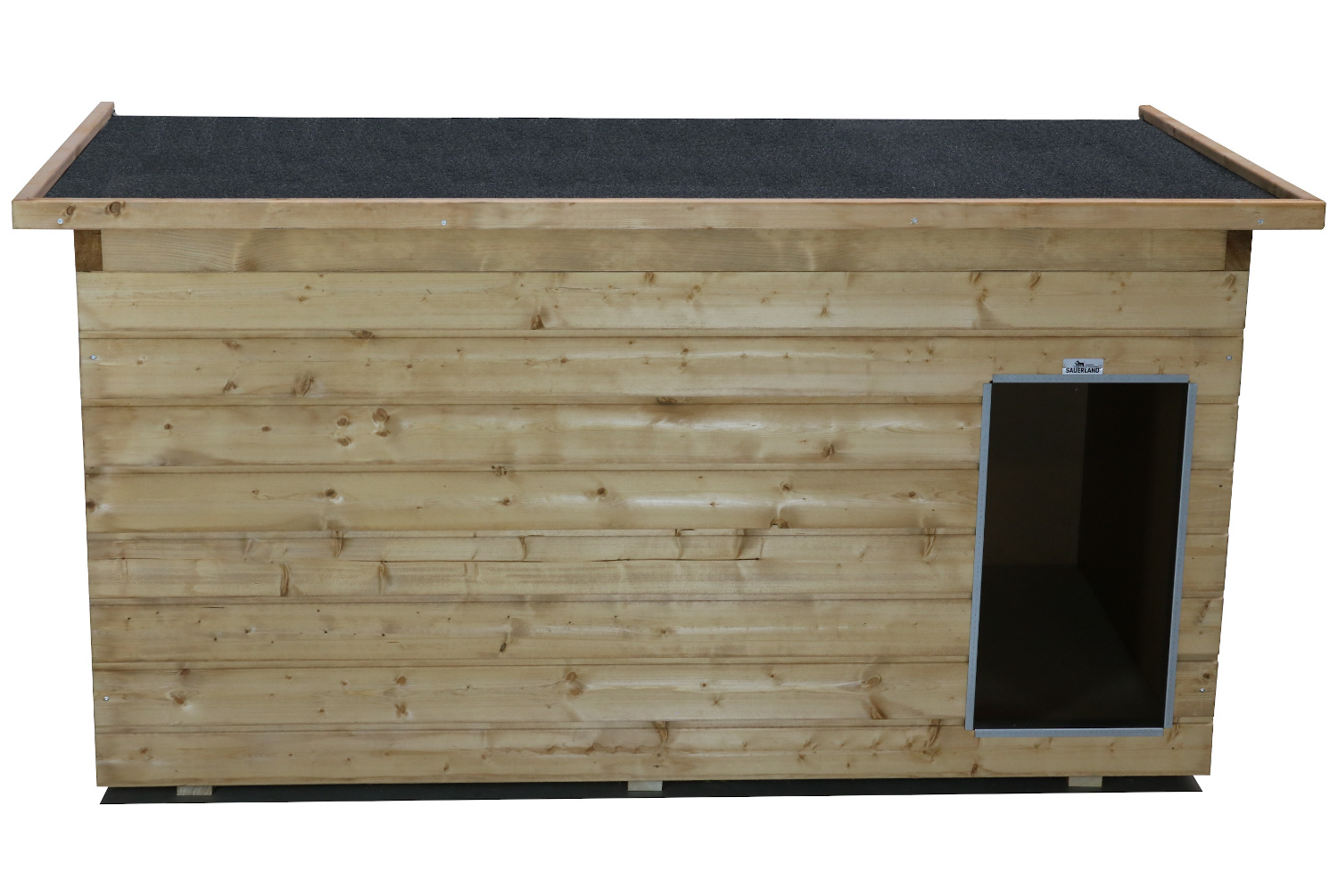 Voll-isolierte Hundehütte aus Holz mit abnehmbarem Dach. Bausatz aus montagefertigen Elementen, schnell aufzubauen.